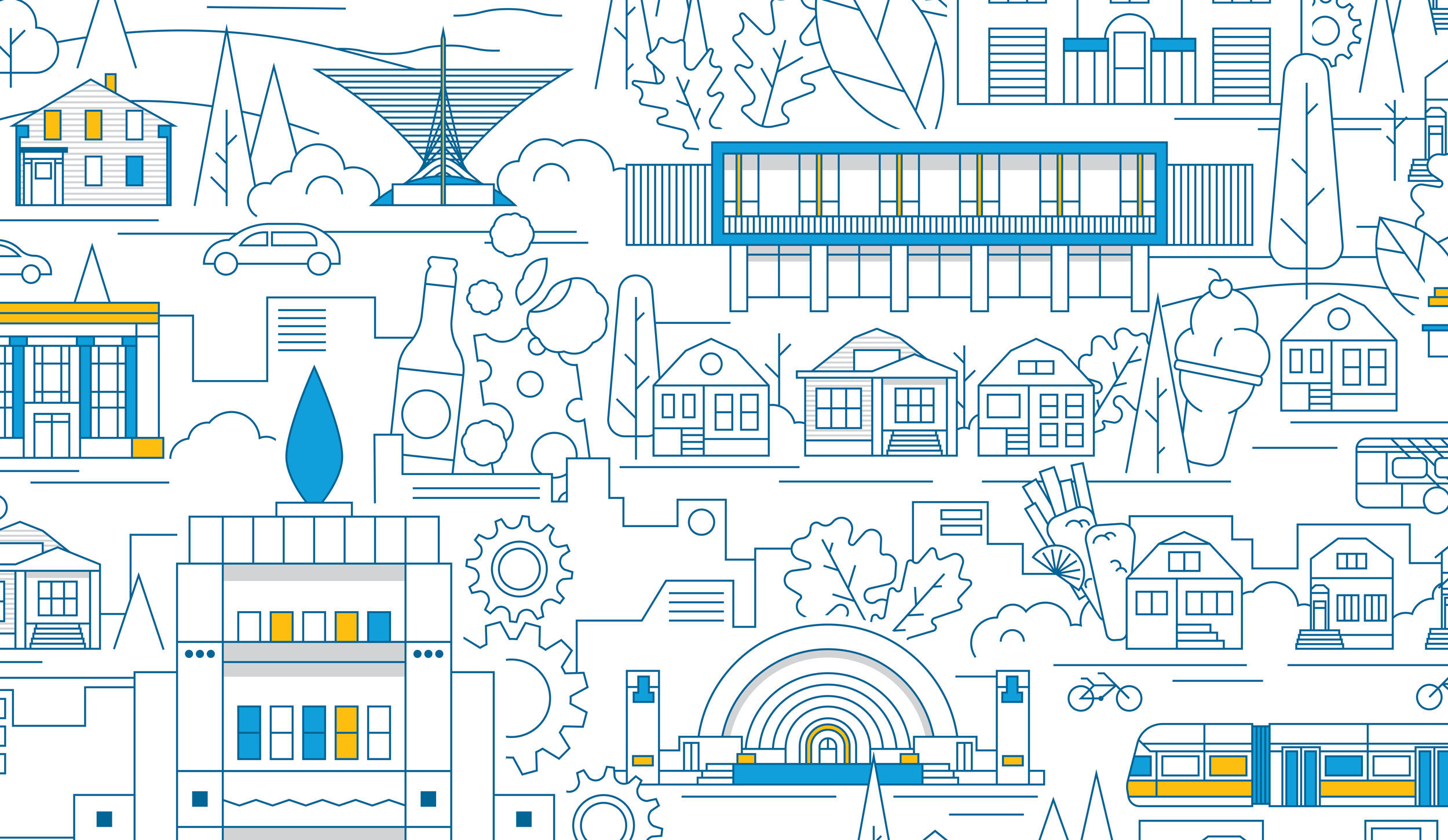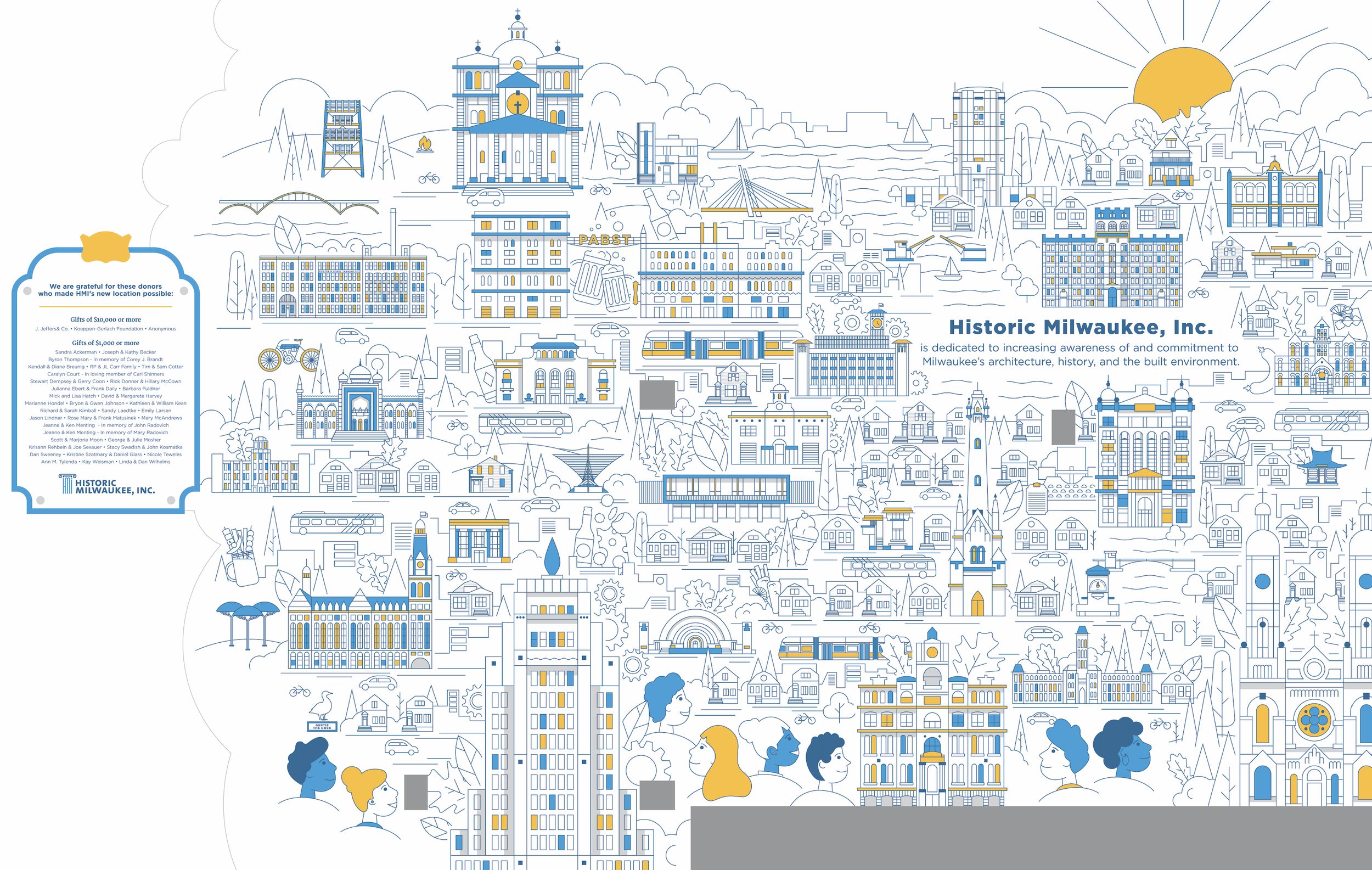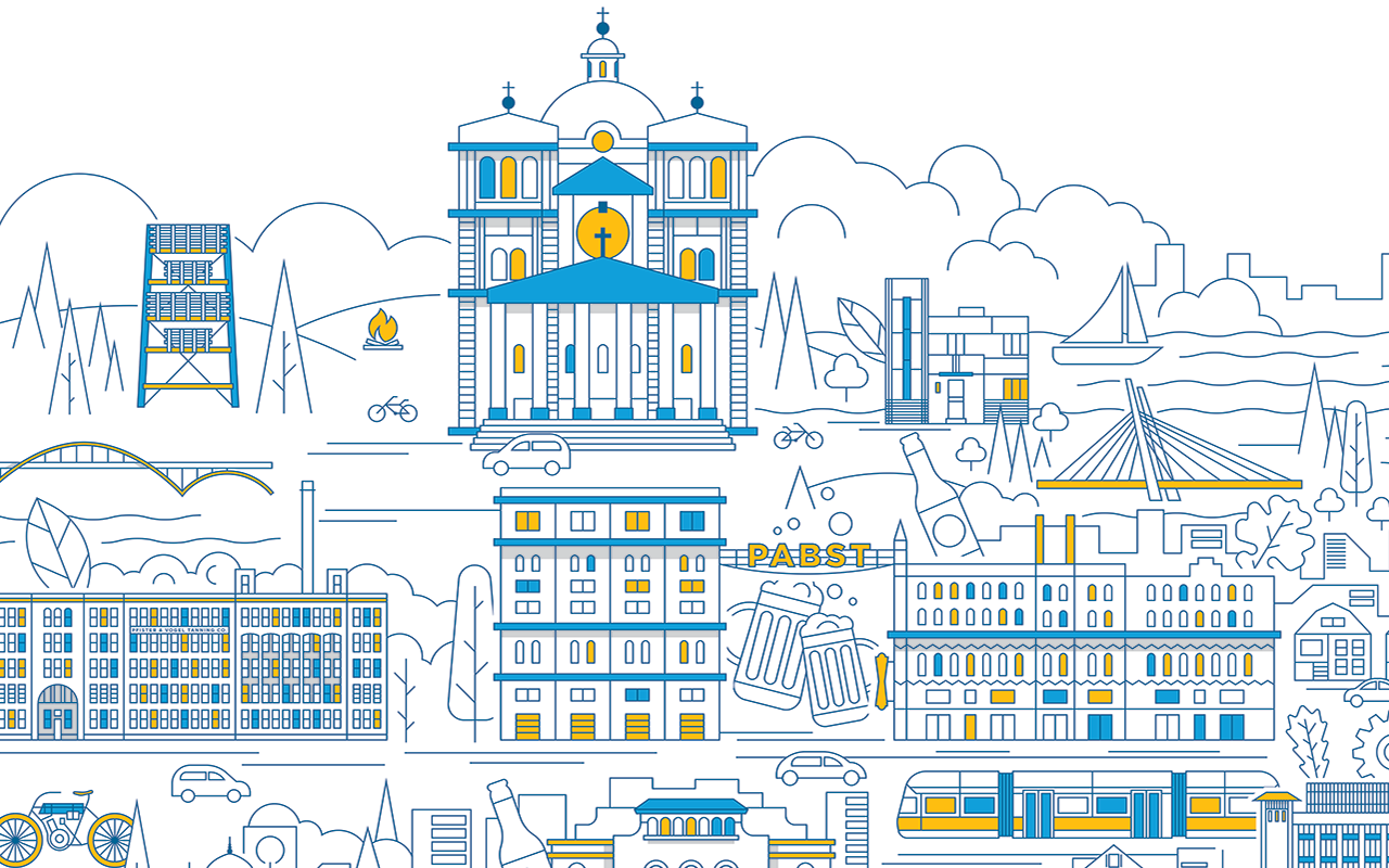 A mural for Historic Milwaukee depicting architectural landmarks, beloved food and drink, and other iconic elements of the city.